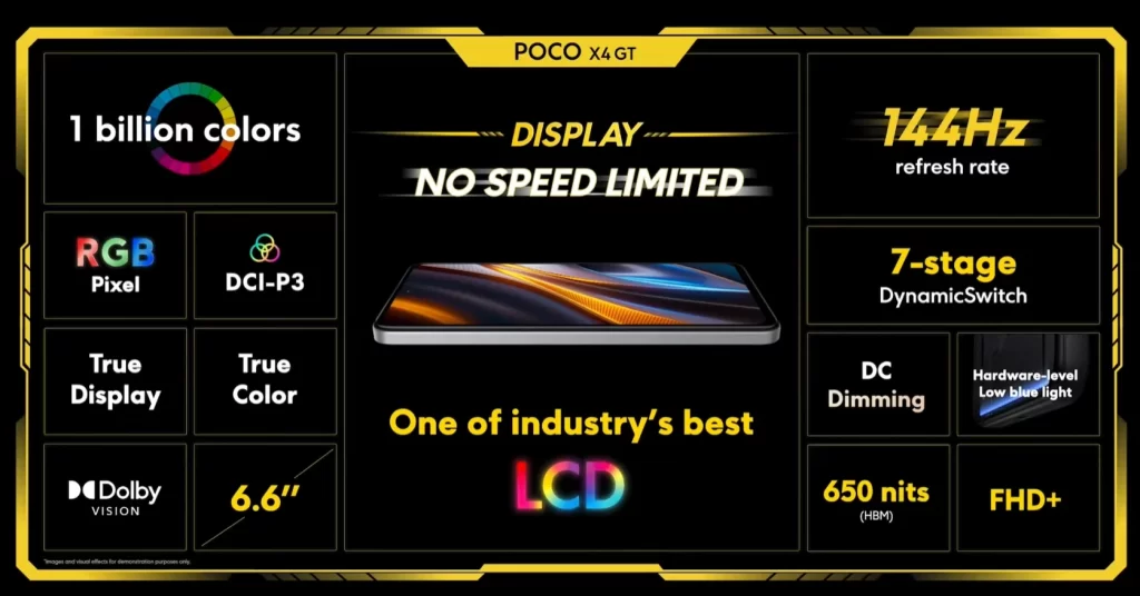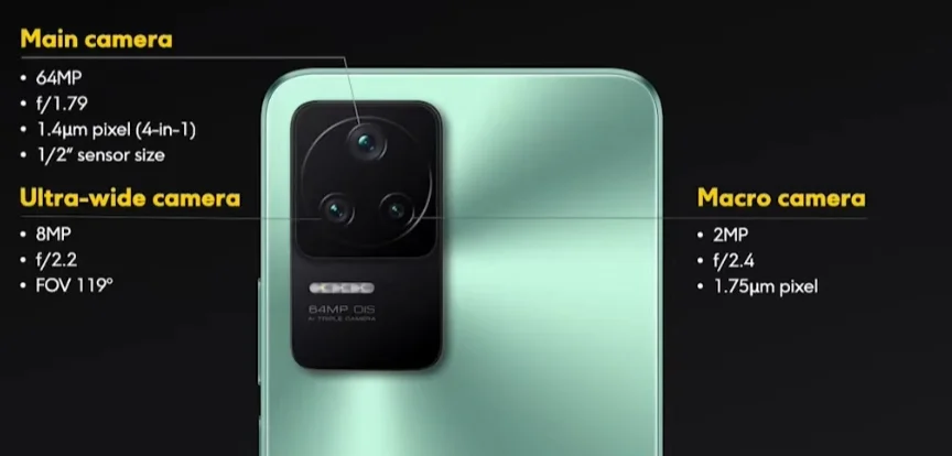 Poco X4 GT je po drugi strani osnovan na Mediatekovem procesorju Dimensity 8100, ki verjetno ni daleč stran od Snapdragona 870. Zaslon je tu LCD, vendar menda eden najboljših te vrste sploh. Med drugim ponuja osveževanje s 144 Hz, če bo to kdo opazil, in ima razmerje stranic 20,5:9, zaradi česar je ožji in tako telefon bolj priročen za držanje. Baterija je velika, s kapaciteto 5080 mAh, priloženi napajalnik pa prav tako omogoča polnjenje s 67 W. Kot pri F4 sta za večpredstavnost vgrajena stereo zvočnika. Tudi tu je na voljo trojna fotoaparat z v osnovi enakimi lastnostmi, vendar brez optičnega umirjanja pri glavnem objektivu.