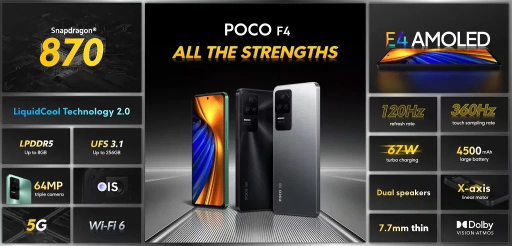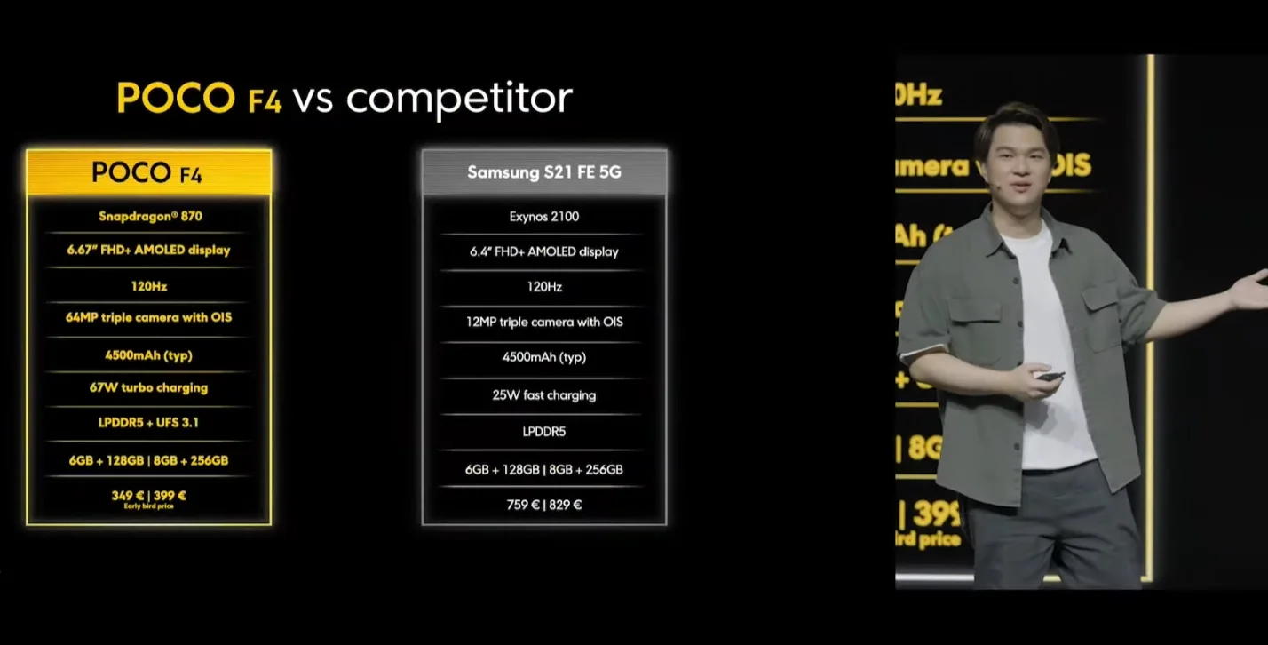 Direktor produktnega marketinga za Poco Angus Ng je na predstavitvi povedal, da mora sodoben telefon izpolnjevati pet ključnih zahtev – imeti mora močan procesor, živahen in hiter zaslon, dovolj baterijske zaloga za cel uporabe, biti prestižen na pogled in otip in ponujati kakovostne kamere v vseh razmerah. F4, nekoliko manj »nabrita« reč kot igričarski F4 GT, naj bi to izpolnjeval s procesorjem Snapdragon 870, zaslonom OLED z diagonalo 6,67 palcev, osveževanjem 120 Hz in najvišjo svetilnostjo 1300 kandel na m2, baterijo s 4500 mAh kapacitete in možnostjo polnjenja s 67 W, kar pomeni da se napolni v največ 38 minutah, debelino ohišnja vsega 7,7 mm in maso 195 g ter glavnim fotografskim objektivom s 64-milijonskim tipalom in optičnim umirjanjem slike.