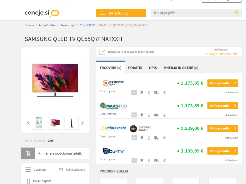 Ni najdražji Samsungov televizor iz »linije« z reklamnim nazivom QLED in če me vprašate, koliko stane, potem vam pri najboljših močeh ne morem pomagati. Bigbang na spletu zahteva debelo prek dveh tisočakov, Harvey Norman tisočaka in pol, pri čemer že dolgo opozarja, da gre za razprodajo zadnjih kosov, ceneje.si pa prikaže dve ponudbi za dobrega tisočaka. Popolna zmeda, ki si je Samsung ne bi smel privoščiti. Kako naj kupec, ki se odloča za nakup televizorjev tega proizvajalca sploh ve, koliko so dejansko vredni? Da je še huje, Samsung na trgih Evropske unije nima poenotenih oznak za enake modele, zato gre morda tudi v tem primeru za različne, česar potrošnik ne po slikah, ne po oznaki, enostavno ne more vedeti. Nekaj odstotkov različne cene so normalne, saj se prodajalci borijo za vsakega kupca posebej, a tisoč evrov razlike … To tudi onemogoča oceno za razmerje med ceno in kakovostjo, saj je ta odlična, če gre za tisoč evrov vreden televizor, a pade na dobro (ali še manj), če stane dva tisočaka.