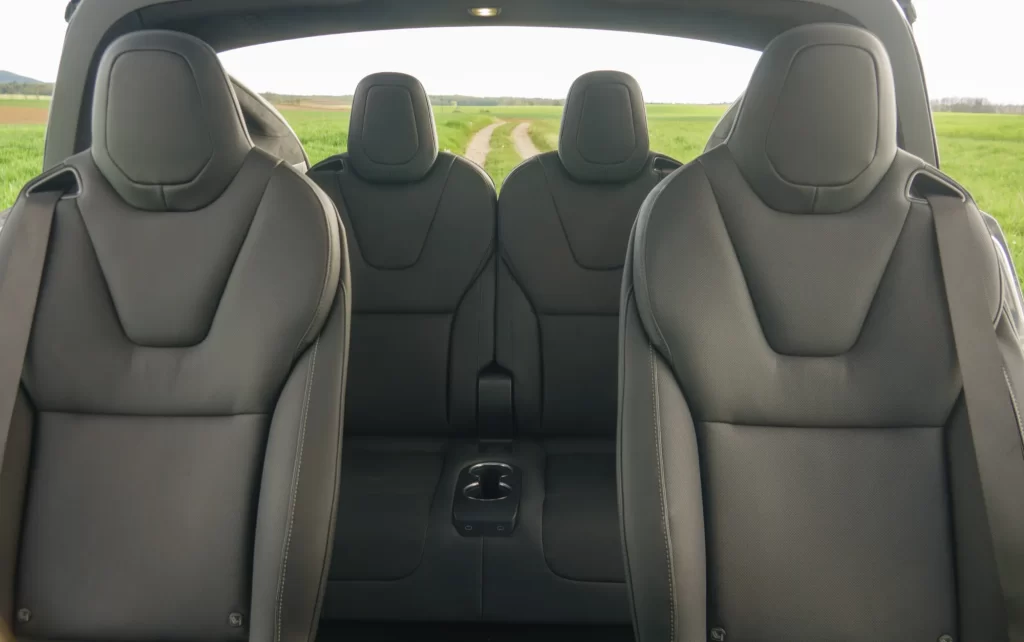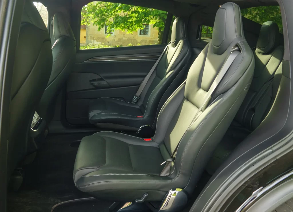 Osrednji 17-palčni ekran ima tokrat dobrodošlo novost, lahko ga nagnemo k vozniku ali sovozniku in ker na njem ni več merilnika hitrosti, je s tem tudi preglednejši. Pod njim sta dve mesti za brezžično polnjenje mobilnikov, osrednji del med prednjima sedežema pa skriva kar nekaj prostora za odlaganje. Oba prednja sedeža sta odlično narejena in nudita tudi nekaj opore za hitrejše ovinkarjenje, a ne pričakujte športnih sedežev, vseeno je udobje v prvem planu. Na preizkusu smo imeli 6-sedežno različico, z dvema sedežema v drugi in dvema v tretji vrsti, ki je glede na konfigurator tudi edina možna pri izvedbi Plaid. Pri običajni sta na voljo sta tudi 5- in 7-sedežna in naš predlog je tista za pet ljudi, če ne rabite nujno prostora za še kakšnega dodatnega potnika in če se lahko odpoveste vlakcu smrti (več o tem kmalu). Namreč, če potnika v srednji vrsti še lahko dokaj spodobno sedita, je tretja vrsta namenjena manjšim sopotnikom, že 1,8 m visoka oseba zna imeti težave. Poleg tega imata 6- in 7-sedežni različici v prtljažniku le še 425 l prostora, če mu dodamo še prednji prtljažnik s 183 l postane vse skupaj bolj znosno, a 5-sedežna vseeno ponuja 1050 litrov prostora, kar je že praktično na nivoju kombijevskega Volkswagna ID.Buzz (ki je sicer krajši, četudi uradno sodi v drugo kategorijo vozil).