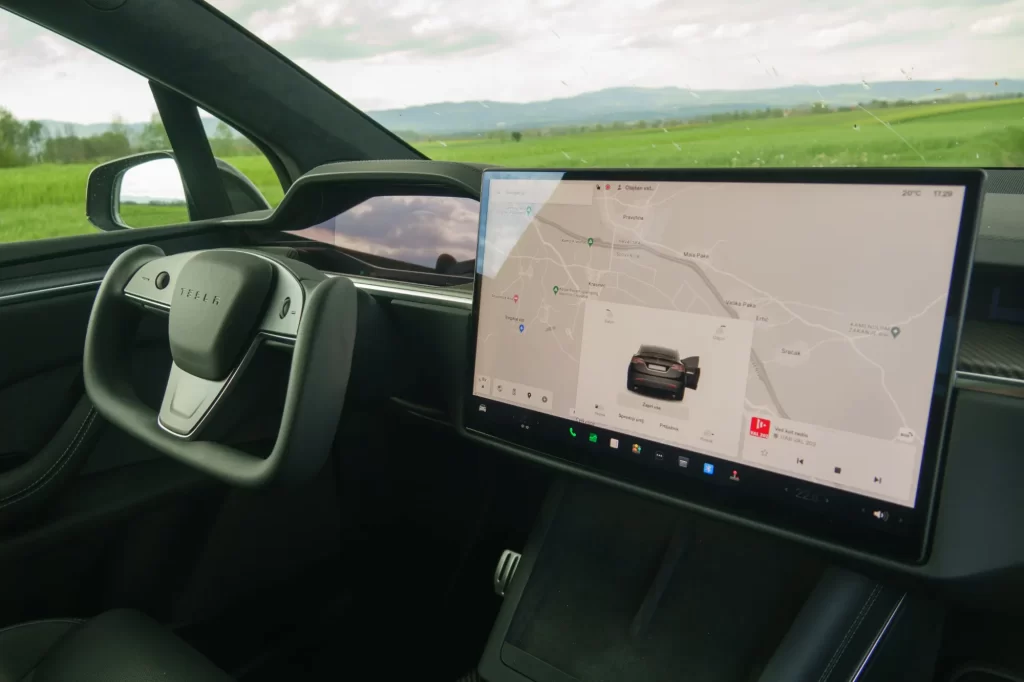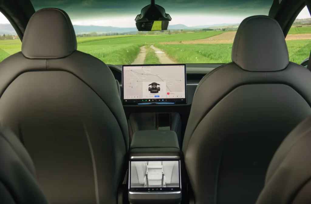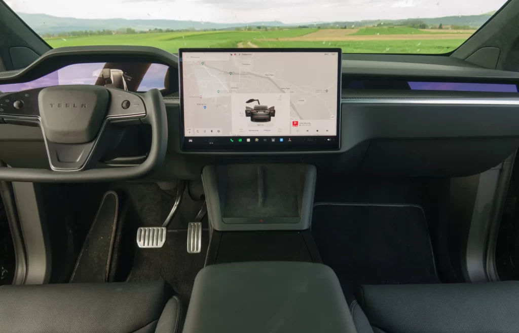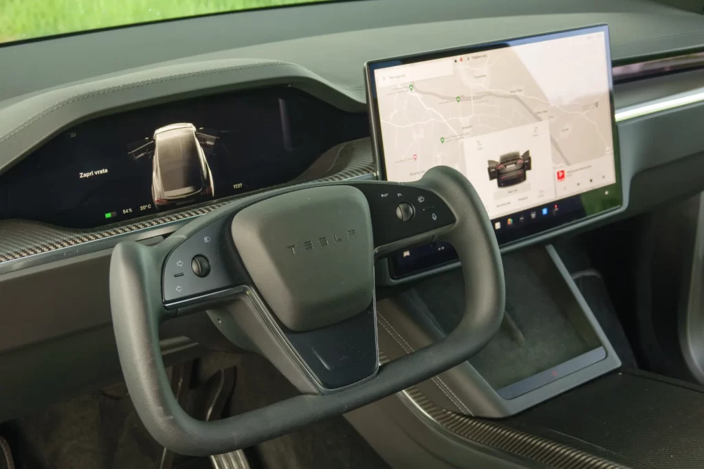 Notranjost je klasična Tesla, z dvema pomembnima razlikama, ekranom pred voznikom in volanom. Za začetek, zaslon z merilniki, čeprav je relativno majhen, odpravlja tisto iskanje hitrosti desno spodaj, ki smo ga vajeni iz modelov Y ali 3. Obenem nudi vse pomembne informacije, vključno s stanjem baterije oziroma dometom. Druga, morda pomembnejša razlika, je volan, prirezan spodaj in še bolj zgoraj, ki mu v angleščini rečejo »yoke«. Pri njem si tudi po testu nismo čisto na jasnem, ali je dobra ali slaba poteza. Zdaj je sicer na voljo za doplačilo, ni več serijski, zato je bil verjetno bolj slaba kot dobra. Za razliko od klasičnega volana je yoke skoraj kvadraten in v gornjem delu brez povezave. Še najbolj spominja na krmila v letalih, a tam imamo način »fly-by-fire,« pri katerem se njegovo obrašanje prenaša kot signal po kablu, medtem ko je yoke trenutno še vedno klasičen volan z drogom. Poleg tega so pri Tesli odstranili obvolanske ročice in tako so smerniki na volanu kot tipke, prav tako luči in brisalci poleg že klasičnih štirismernih vrtljivih gumbov, znanih iz modela 3 in Y. Volan se pri vožnji na avtocesti, kjer je malo zavijanja, odlično izkaže, zaradi oblike in držanja imamo ves čas obe roki na volanu, kar je edino pravilno, a ko pridemo na navadne ceste oziroma v krožno križišče, se stvari zapletejo. V kakšnem manjšem krožišču imamo volan postavljen praktično navpično in v takih primerih se izkaže iskanja gumba za smerokaz dokaj problematično. Morda se čez čas lahko voznik na to navadi, nam ni uspelo. Tudi pri prehitevanju je iskanje gumba za smerokaz lahko problematično, tako da nov volan jemljemo dobro mero zadržanosti. Če bi bil »drive-by-wire,« se pravi da bi se obračanje koles prilagajalo hitrosti in temu, koliko je volan obrnjen, in bi ga bilo treba zelo malo zasukati, bi bil prava izbira, tako pa smo pri mestni vožnji s takim volanom rahlo omejeni v primerjavi s klasičnim, še posebej na ta račun, da ni več obvolanskih ročic. Če niste prepričani o novem volanu, se morda dogovorite za testno vožnjo s tovrstno Teslo.