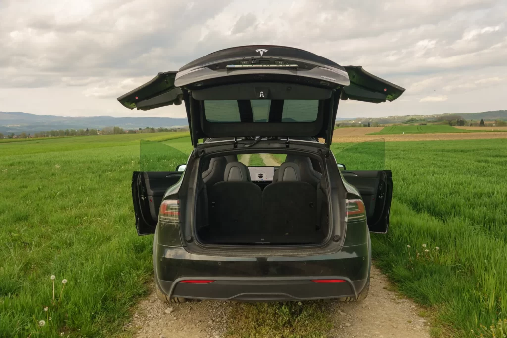 Novinec se od starega modela vsaj na prvi pogled ne razlikuje veliko, večino sprememb se skriva pod pokrovom in v notranjosti potniške kabine. Dobrih 5 metrov dolg SUV, ki ima značilen Teslin nos, se v srednjem delu lepo dvigne in nato počasi spušča proti zadnjemu delu, kot smo že vajeni pri drugih vozilih. Na prtljažnih vratih je tudi spojler, ki ni tam le zaradi lepšega, saj je končna hitrost avta 262 km/h (elektronsko omejena). Ali to drži, nismo preizkušali, se pa števec v Sport načinu tudi nad omejitvijo na naših avtocestah hitro dviguje in avtu razen zvoka motorja, ki ga v tem primeru odpade, nič ne manjka. Model X želi biti udoben avto v vseh možnih primerih, zato se vsa vrata avtomatsko odpirajo, tudi sprednja. Zadnja, imenovana Falcon Doors, so še malo bolj posebna, saj se odpirajo navzgor, kot pri Mercedesu 300SL »Gullwing«, in ker imajo vmes dodaten tečaj, rabijo zelo malo prostora, da se dvignejo. Drsna vrata bi bila morda še uporabnejša, a z njimi težko poveste, da imate prav poseben avto. Ko se usedete v avto, je na voznikovi strani dovolj, da pritisnete zavoro in vrata se sama zaprejo, a dokler ne boste zapeti, se avto ne bo želel premakniti. Ko zapustite avto in če imate telefon namesto kartice za odklep, ne rabite zapirat vrat ali dvigovat oken, avto to postori namesto vas. V slabem tednu dni so nam take malenkosti tako zlezle po kožo, da smo se v starem avtu čudili, zakaj se se nič ne zgodi samo od sebe.