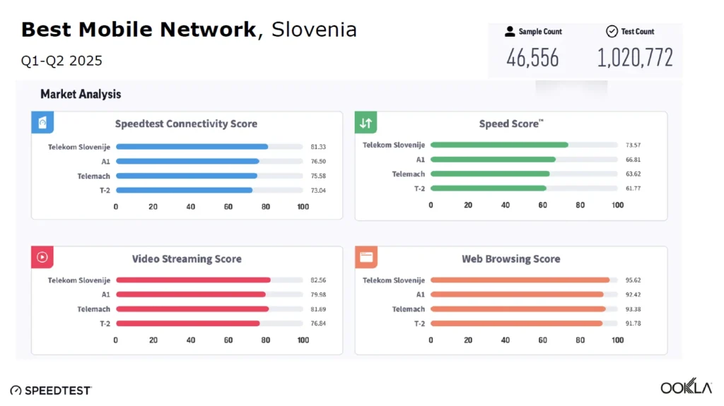 Kot poudarjajo v Ookli, je predvsem zaradi izboljšanih rezultatov prvega, tudi »rating« Slovenije zrasel. Naša država je tako na najnovejši lestvici tega podjetja glede hitrosti mobilnih omrežij (z letošnjega avgusta) na osmem mestu. Pred Švico, Francijo ali Avstrijo ter tudi Švedsko in Finsko. Z majhno prednostjo, vendar jo obdrži, ko bodo vsi trije operaterji do konca tega in v prihodnjem letu še dodatno nadgrajevali omrežja in povečevali pokritost s 5G zaradi obvez iz večfrekvenčne dražbe.