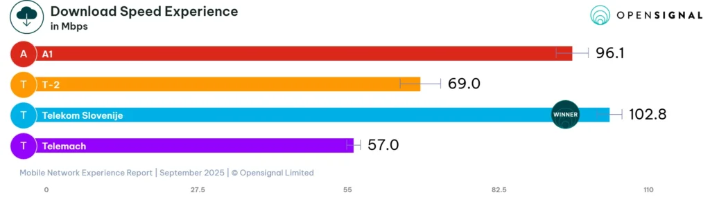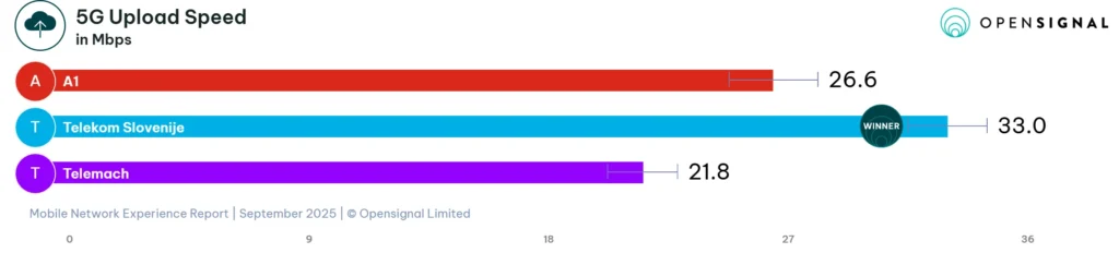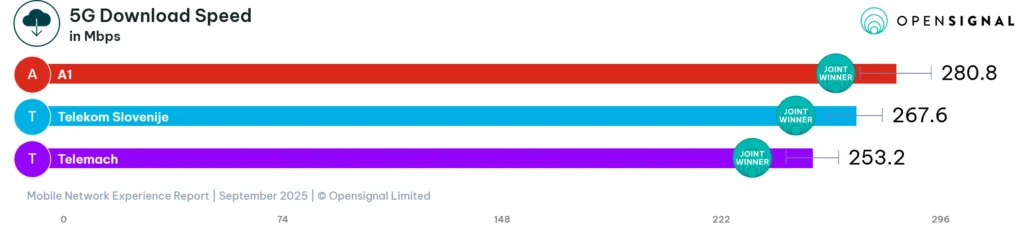 Ookla pri hitrostnih rezultatih ne dela razlik med dostopovnimi tehnologijami, medtem ko Opensignal loči med »skupnimi« številkami in tistimi prek 5G. Pri slednjih je v meritvi pritočnih hitrosti na prvem mestu A1 z 280 Mb/s, za 13 Mb/s zaostaja Telekom Slovenije, še približno toliko pa Telemach. Operaterji so torej kar izenačeni in vsi dovolj dobri, da so si prislužili naziv »sozmagovalcev.« Toda v skupnem pogledu je prvi Telekom z nekaj več kot 100 Mb/s, dokaj blizu je še A1, medtem ko druga dva precej zaostajata. V odtočnih hitrostih prek 5G je Telekom precej spredaj, tako skupno kot še bolj prek 5G.