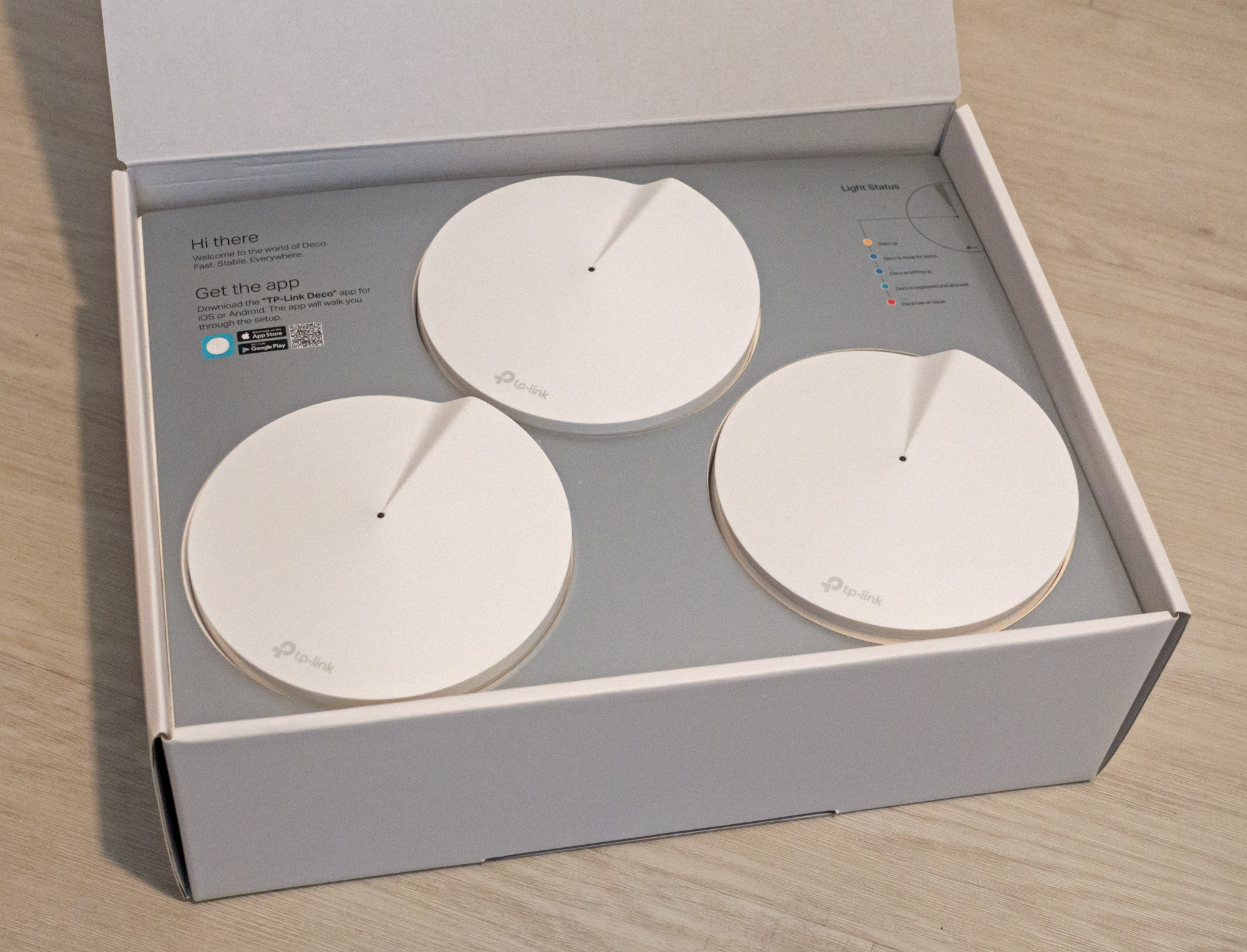 To zgoraj je večinoma teorija, kaj pa Deco M5 pokaže v pravem, za brezžične valove kar zahtevnem domu z nekaj debelimi stenami in tremi etažami (kletjo, pritličjem in nadstropjem)? Precej, ampak začnimo pri osnovah in nastavitvi. Tako dražje kot novejše in cenejše TP-Linkovo prepletanje je mogoče kupiti v kompletu dveh ali treh usmerjevalnikov. Seveda pa so na voljo tudi posamezni, če komu niti trije ne zadoščajo ali če kakšen »odleti« (tudi v tem primeru je omrežje dovolj pametno, da poišče nadomestne poti in nemoteno deluje naprej). Za omenjeno domovanje je prišel v poštev trojček identičnih okroglih in nizkih, rahlo kapljičastih usmerjevalnikov. Izkazalo se je, da to povsem dovolj za približno sto kvadratnih metrov etažne površine, pa še za pokrivanje malo dvorišča in vrta po vrhu. Verjetno bosta za marsikatero stanovanje več kot dovolj dva, kar je tudi s hitrostnega vidika tudi optimalno, kajti dodajanje točk povečuje kompleksnost pretakanja podatkov in zato zmanjševanje hitrosti. Vsak od usmerjevalnikov je precej minimalističen in se zlahka vklopi v opremo stanovanja, sploh ne kliče pozornosti nase. Na vrhu je statusna »lučka«, da se jo tudi izključiti, če koga moti, ob robu pa so luknja za napajalnik (v prvi generaciji je bila ta USB-C, zdaj pa ima svoj okrogel priključek) in dva priključka LAN/WAN. Tu se eden od usmerjevalnikov priklopi na modem in od tod gre domača »mreža« naprej po stanovanju. Preostali se potem lahko povežejo nanjo za še bolj robusten prenos podatkov, seveda pa se da tudi z računalniki, televizorji in drugimi napravami priključiti žično. Edini problem je, da bo mogoče treba kar kmalu poseči še po kakšnem stikalu z dodatnimi priključki, kajti dva na sami napravi sta hitro premalo. Po drugi strani pa je res, da je komplet primarno namenjen vzpostavitvi brezžičnega omrežja in da konkurenca večinoma ne ponuja nič več fleksibilnosti na tem področju.