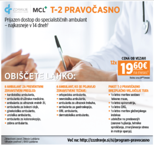 Omenjeni zavod namreč svojim strankam nudi (skoraj) neomejen dostop do specialistov, če so le pripravljeni za to vsak meseč odšteti 28 evrov. Paket so v T-2 preimenovali v T2 Pravočasno, ki mesečno stane manj, slabih 20 evrov. Naročnik ima na voljo osem ambulant, ki jih je priporočljivo obiskati še pravočasno kot preventivni pregled (kardiološka ambulanta, ambulanta družinske medicine, ambulanta za ultrazvok vratnih žil, ambulanta za bolezni dojk, ginekološka ambulanta, urološka ambulanta, ambulanta za kolonoskopijo in zobna ambulanta), in šest ambulant, v katerih je mogoče opraviti celostni zdravstveni pregled v primeru nenujnih težav (ortopedska ambulanta, nevrološka ambulanta, ambulanta za ultrazvok trebuha, ambulanta za gastroskopijo, ORL ambulanta, dermatološka ambulanta). Na željo oziroma zahtevo vas bo specialist “sprejel in pregledal” najkasneje v dveh tednih, le izjemoma treh, poleg tega pa imate pravico obiskovanja predavanj, ter enkrat letno do meritev sestave telesne mase, spirometrije, EKG in gleženjskega indeksa.