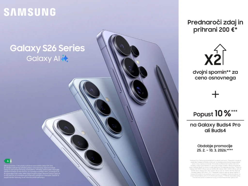 Serija Galaxy S26 je zasnovana kot celovit paket, ki združuje zmogljivost, varnost, napredne kamere in inteligentne funkcije. Prednaročilo z dvojnim prostorom za shranjevanje je zato več kot le promocija. Je način, kako blagovna znamka pokaže stabilnost in zanesljivost v času, ko uporabniki pričakujejo večjo vrednost za svoj denar. Za vse, ki telefon uporabljajo kot glavno napravo za delo, ustvarjanje in zabavo, je to ponudba, ki jo je smiselno izkoristiti.