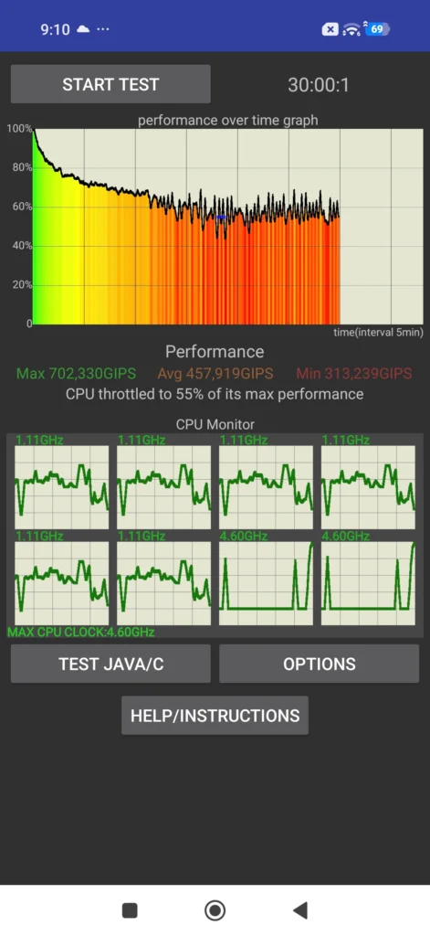 Nisem opazil, da bi se telefon kljub zmogljivemu procesorju kakorkoli pretirano grel, razen ob stresnem testu. Takrat je na vrhu in okoli izbokline z objektivi občutno oddajal toploto, a manj kot Xiaomi 17. Razlog ni le v tem, da je ta manjši, temveč očitno tudi v izboljšani učinkovitosti hlajenja oziroma prenosa toplote s procesorja na ohišje. To je razvidno iz grafa omejevanja hitrosti jeder, ki ni pretirano strm in brez globokih padcev v rdeče območje. Kljub temu so zmogljivosti po pol ure obremenitve padle na 55 odstotkov začetnih. Kar ni nič katastrofalnega, saj so tolikšne obremenitve v realni uporabi kratkotrajne.